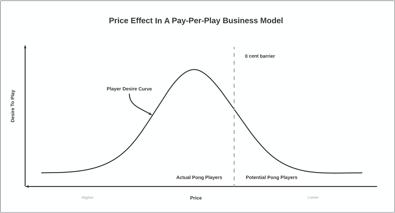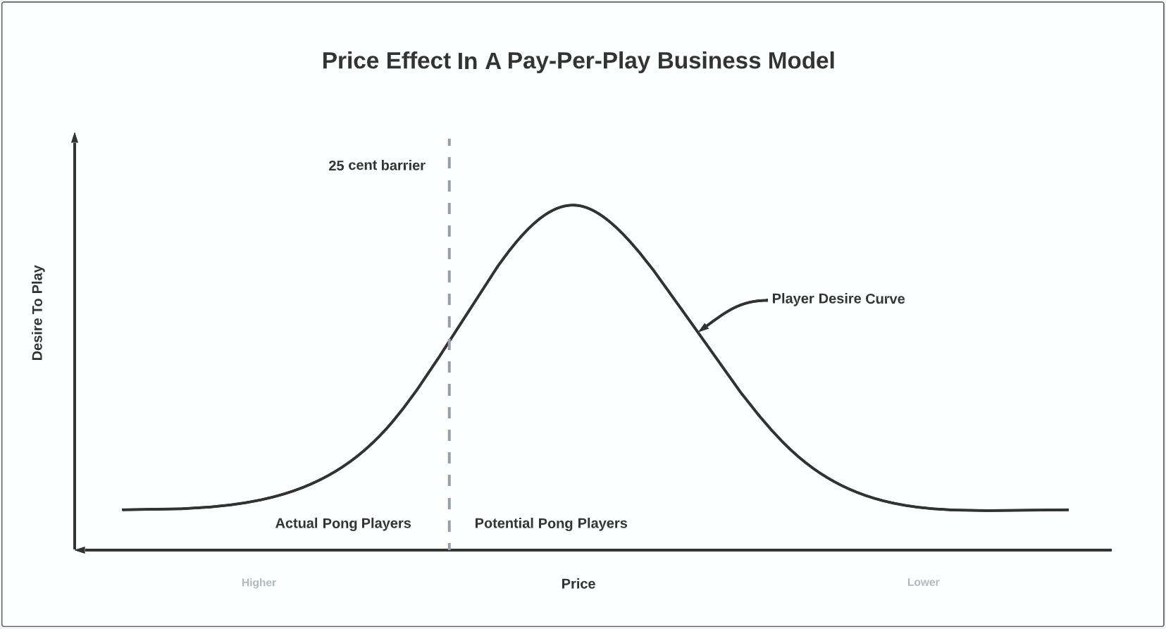 The second variable is the price, which acts as a barrier preventing anyone whose own desire to play Pong falls below it from making a purchase. This can be visualised as a vertical line on the bell curve distribution of Player Desire, and moving it from its original value of 25 cents provides an approximate visual representation of how many people would be likely to play Pong at different price points.