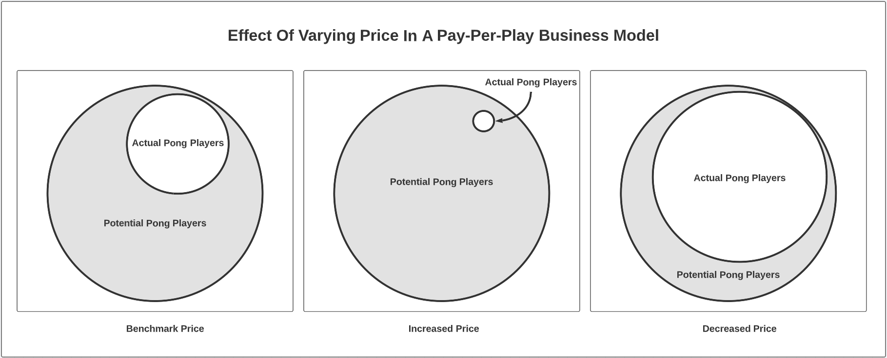 As the price per game tends from 25 cents towards infinity, the subset of actual Pong players would shrink very quickly until it contained none of the people in the bar. The actual Pong players set would decline from 25% to 0%, since fewer and fewer people would value the experience Pong provided at each increasing price point. This is an assumption of course, as there are goods whose demand increases with their price, called Veblen Goods or Giffen Goods, but these are exceptions in economics and I've yet to see any evidence to suggest that videogames exhibit such properties.